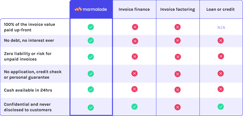 The real standout compared to other forms of business finance is that Marmalade is low cost with no risk. It’s a simple and affordable way to boost your cash-flow with only a small one-off fee and zero interest. When you cash-in an invoice, Marmalade takes on all the late, or non-payment, risk. Unlike a loan, you can just sit back, relax, and watch the cash flow into your business.